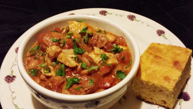 Remove both breast lobes from the Rotisserie chicken and cut into cubes. After contents have simmered 30 minutes, stir cubed chicken and sausage into simmering ingredient, cover and heat an additional 15 minutes on low heat. Serve with fresh parsley and honey corn bread (recipe below).