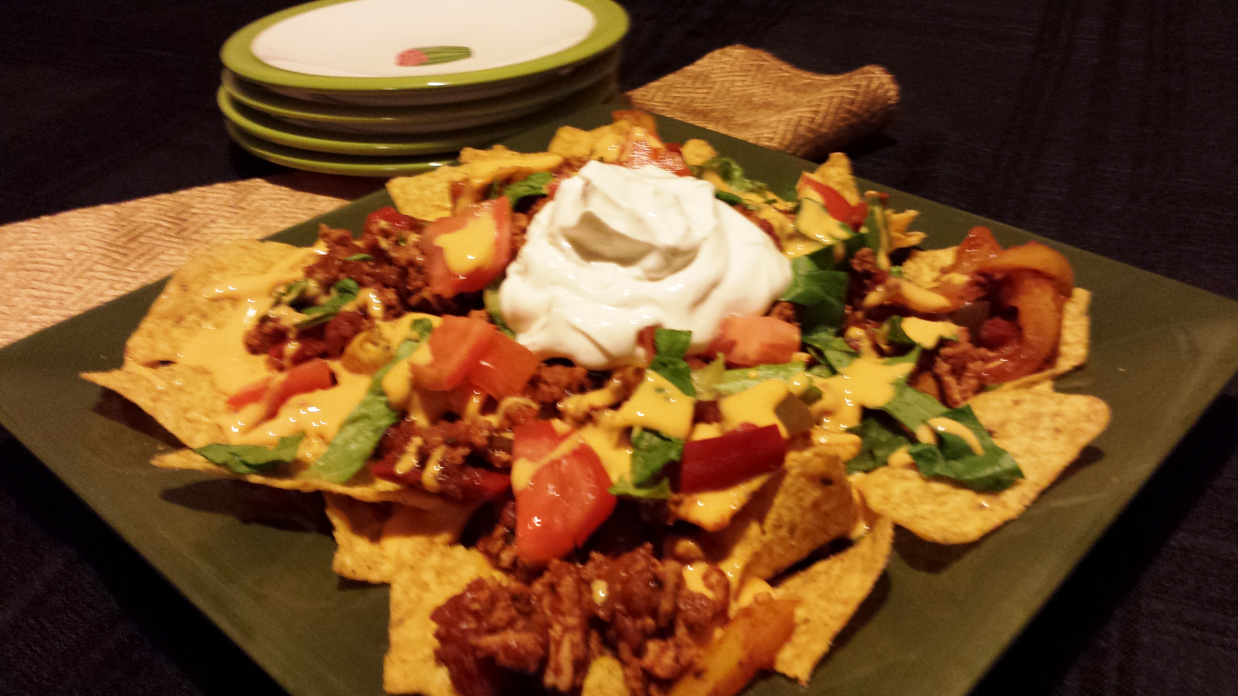 Arrange chips on a large platter. Pour ¾ of with melted cheese sauce on chips. Top with meat sauce followed by lettuce and tomatoes. Pour remaining cheese sauce over chips and garnish with a generous dollop of sour cream.