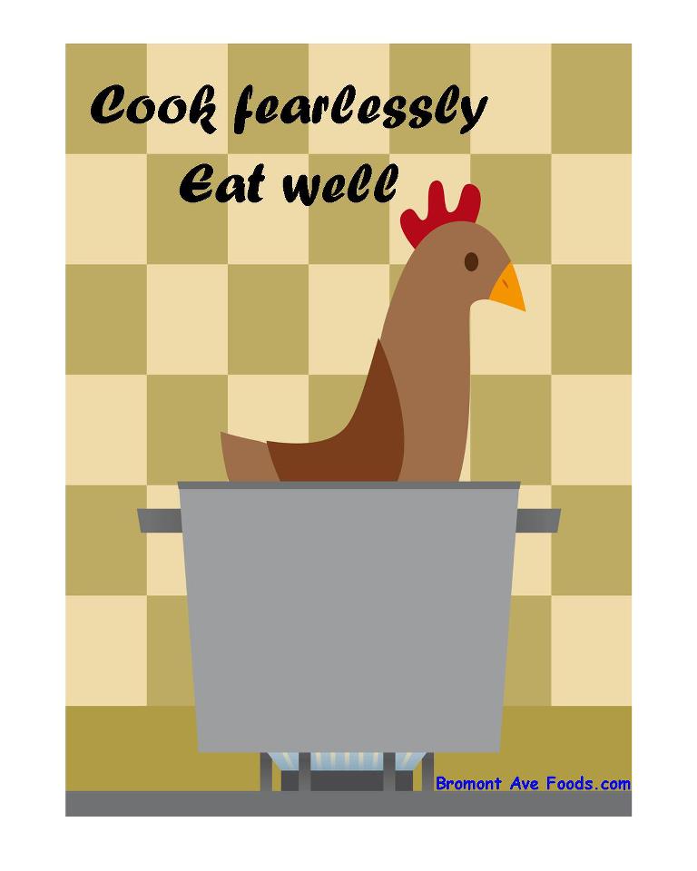 That’s what I do. I live by this. And this motto just happens to be the slogan on my inspirational poster too. You see the little chicken cooking in the pot is a brave soul whose fate is certain – it will be the entrée to eating well. Well apparently it’s a motto adopted by my 27-year-old son, I recently learned.