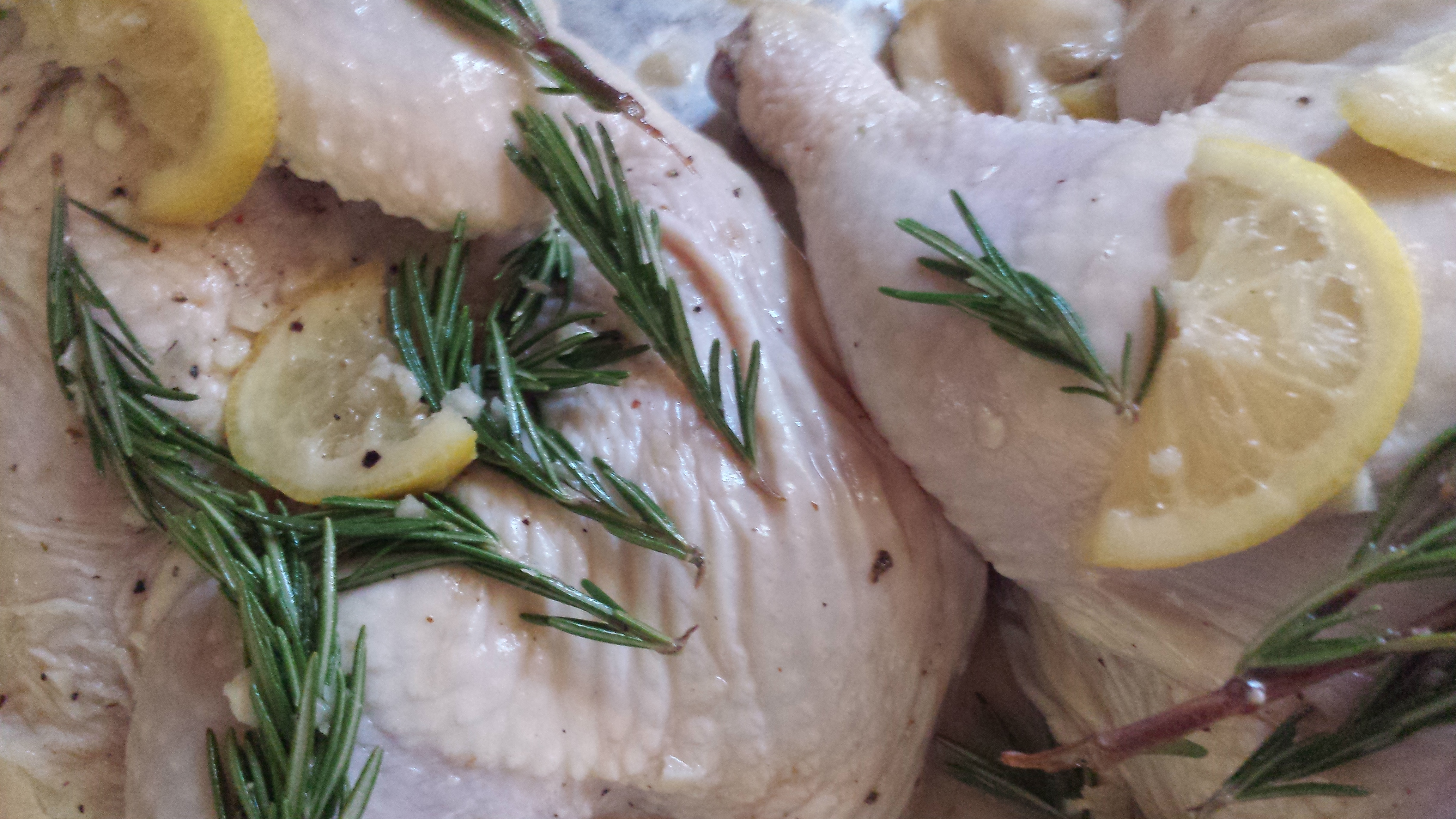Cut 12 to 16 slices of lemon and insert 6 to 8 slices in each bag, some on top of the chicken, some on the underside. Insert 6 to 8 stalks of rosemary in each bag as well, some on top of the chicken, some on the underside. If the stalks are long, break them in half.