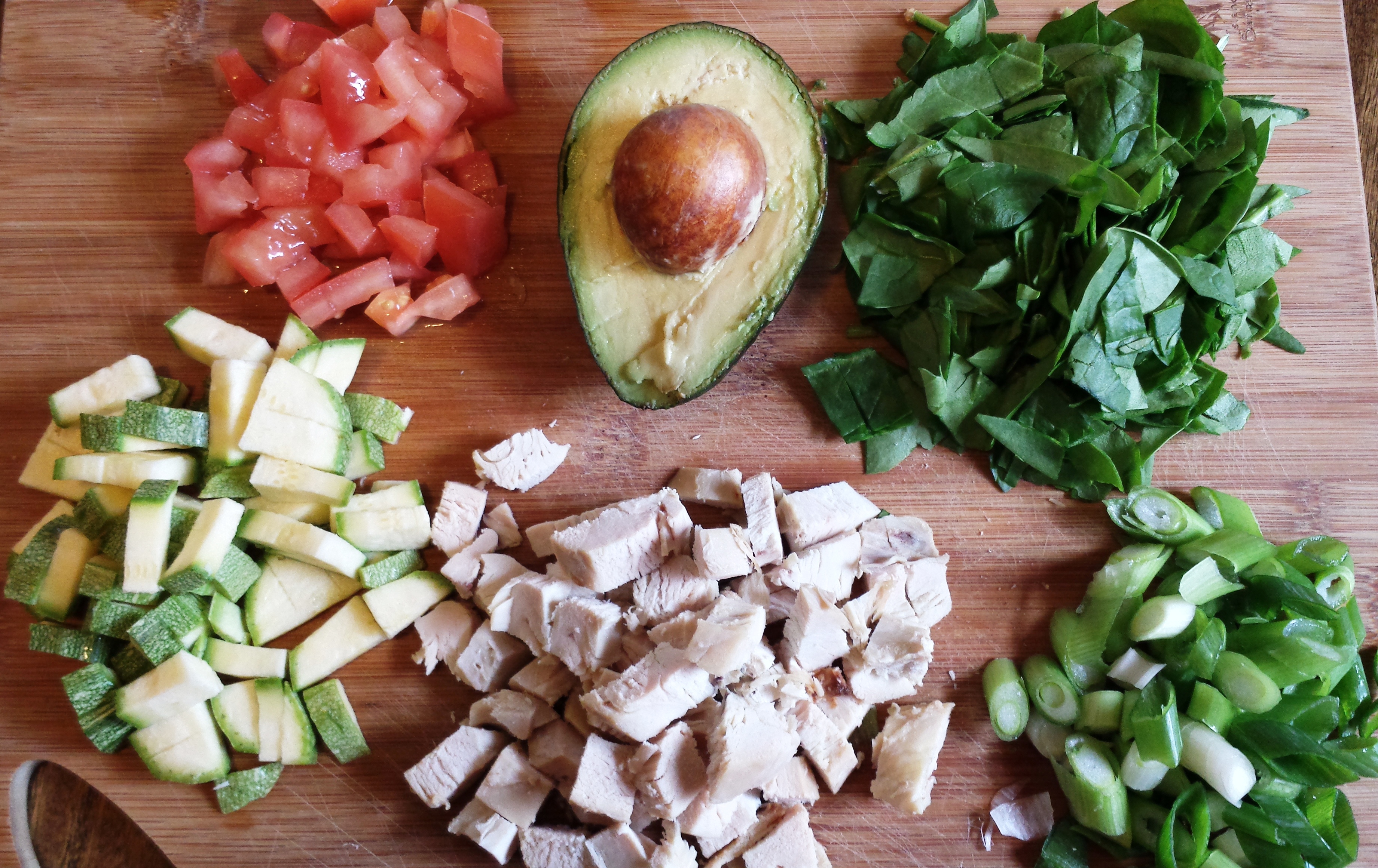 Heat coconut oil in non-stick skillet over medium heat. Once melted, add zucchini and sauté until tender. Add onion, tomatoes and chicken and spinach and sauté until well heated. Pour eggs into skillet. Add salt, cracked pepper and crushed red pepper to taste.