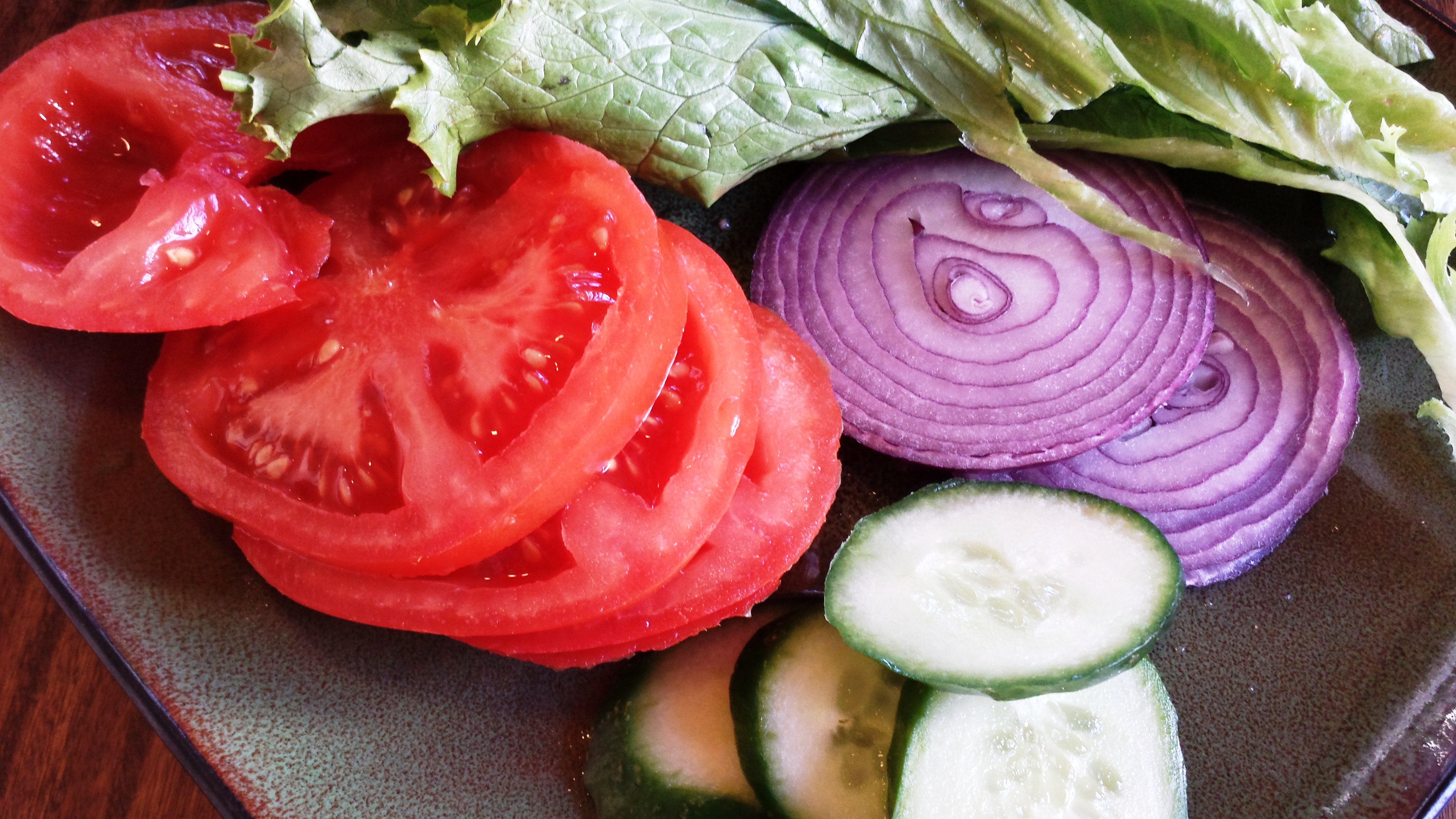 Featured here: organic ground turkey patty, red onion slice, beef steak tomato slice, Vermont white cheddar cheese slice, green leaf lettuce, Persian cucumber slices, homemade aioli (organic mayo, Sriracha hot chili sauce, honey, chopped chives), served on a whole wheat Kaiser roll.
