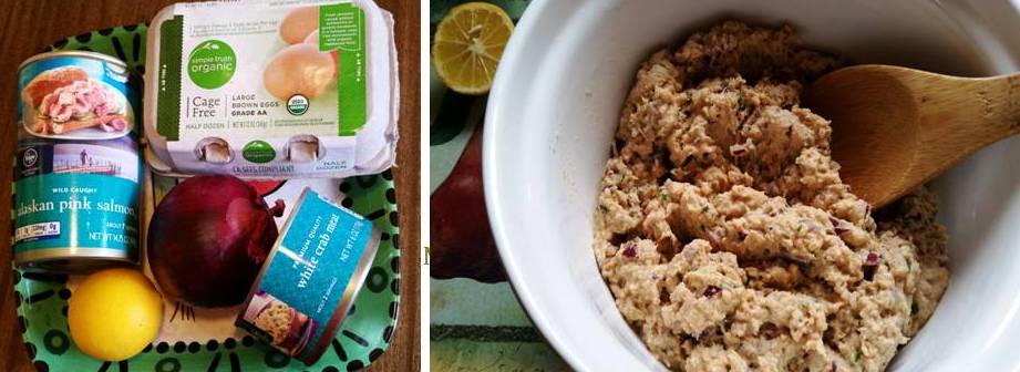 Open salmon and drain off all liquid. Empty contents into a mixing bowl. Remove larger bones and discard.Open crab meat and also drain off all liquid. Add contents to the mixing bowl. With a fork, break apart salmon and mix to incorporate crab meat. All ingredients except flour and corn meal, and mix well. Then add flour and corn meal and mix well.