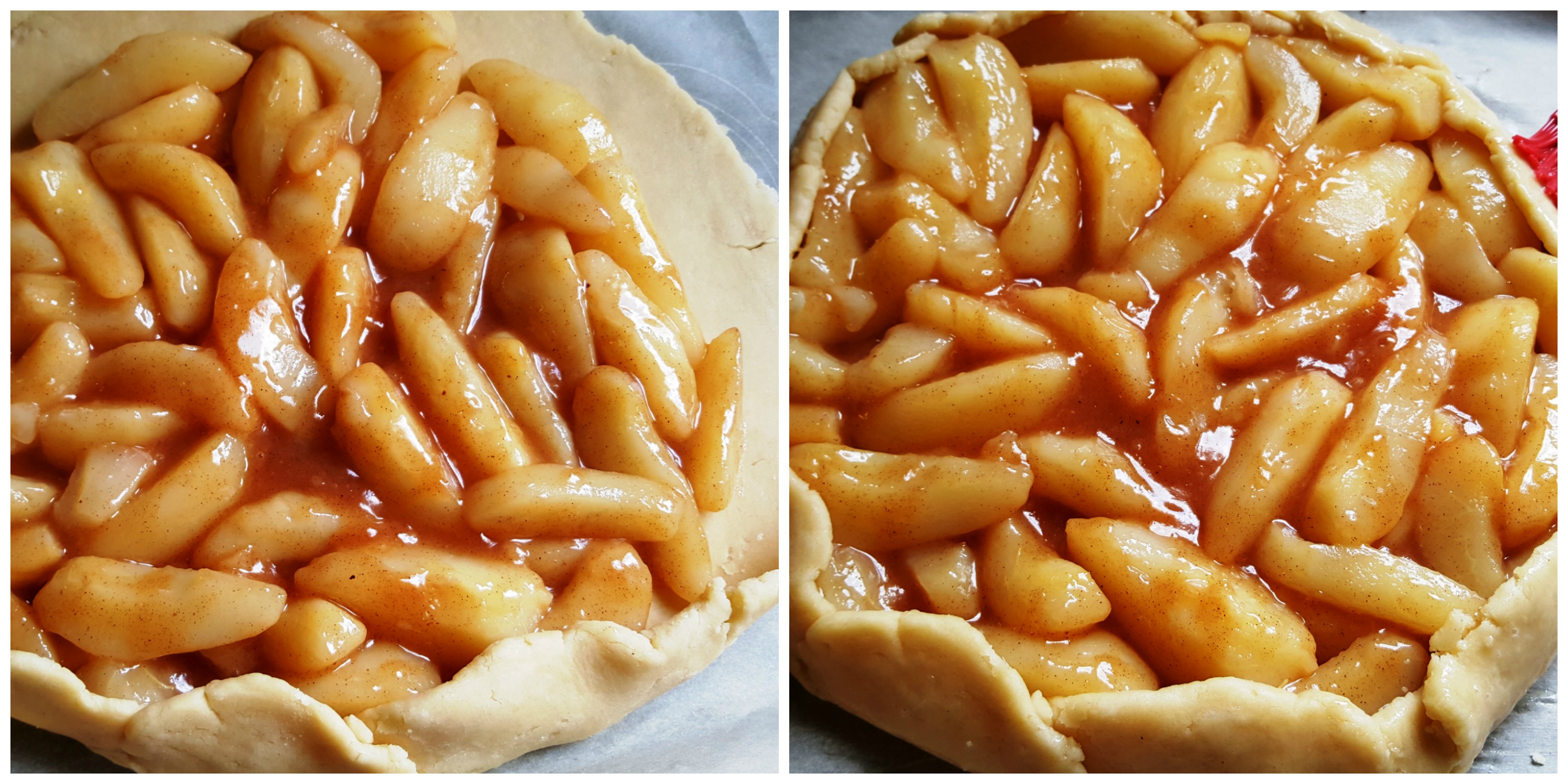 Remove from heat and cool 5 minutes. Place pie crust that has been rolled out to about an 11 inch round on a baking sheet lined with parchment paper. Pour pear filling onto a round pie crust. Spread pear filling leaving about a two inch boarder. Fold the dough over the pear filling, pressing gently to seal the dough which will partially cover the pear filling. Brush the folded edges with an egg wash. (See basic pie crust and egg wash recipes below.)