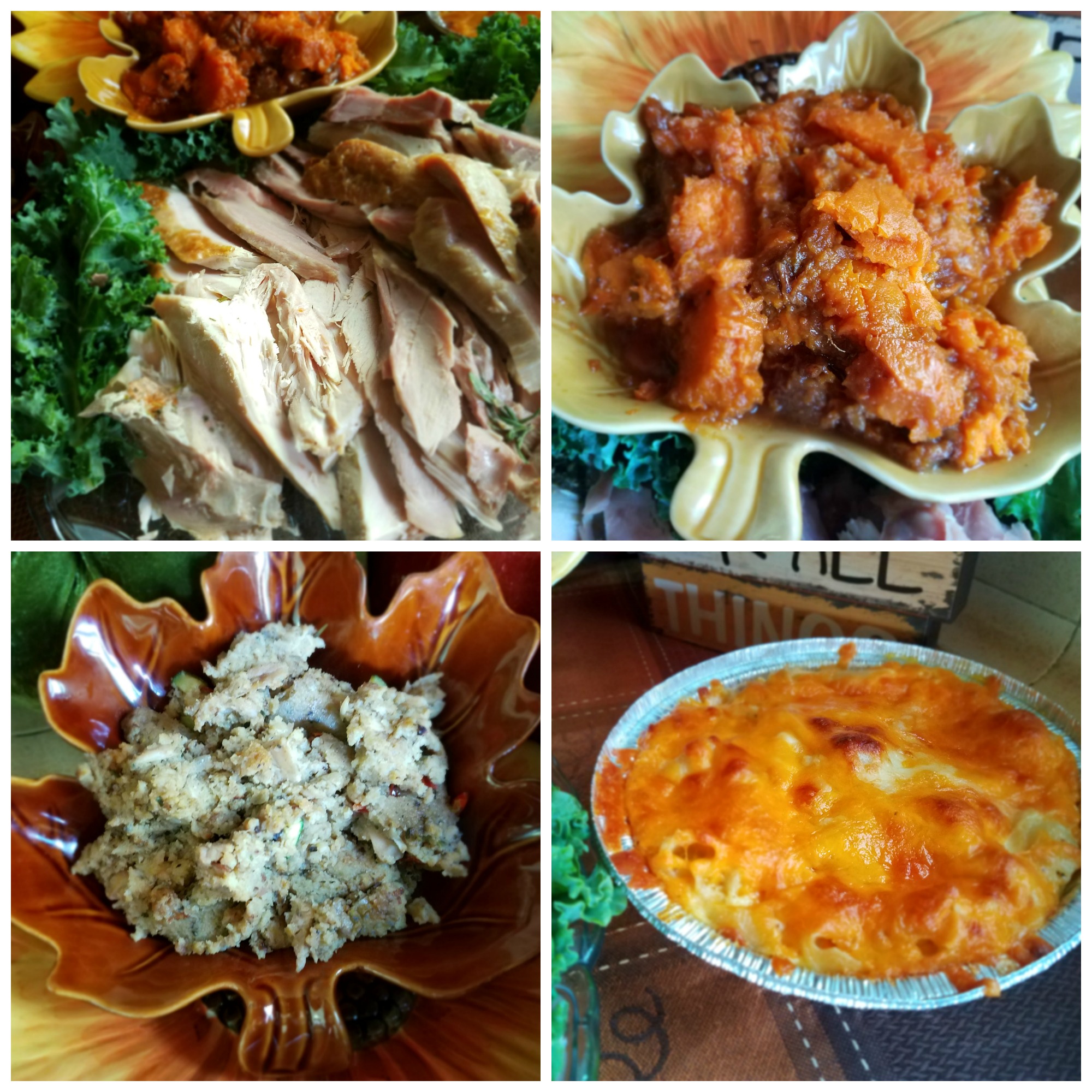 A few of Chef Daria’s favorite Thanksgiving entrees. Left top: Herb brined turkey. Left bottom: cornbread dressing. Right top: candied yams. Right bottom: macaroni and cheese.