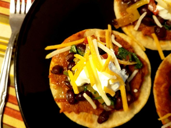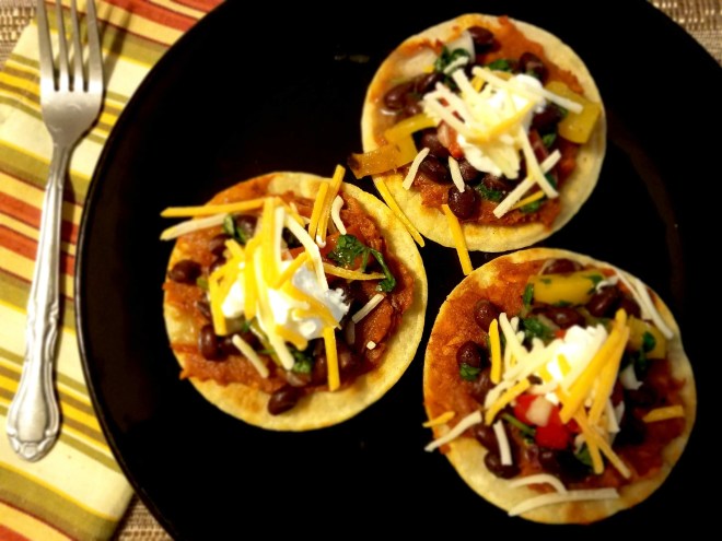8.  To assemble tostadas, spread a heaping spoonful of the warmed sweet potato and ancho chile filling on each fried tortilla. Spoon black bean salsa on each tortilla and top with sour cream if you like, and your favorite grated cheese.