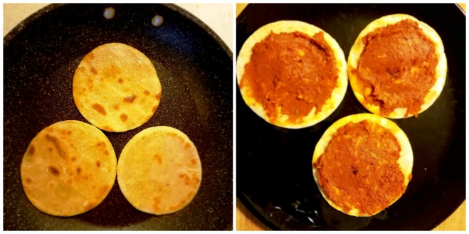 Left: Taqueria size tortillas frying in a large skillet. Right: a heaping spoonful of the warmed sweet potato and ancho chile filling on  fried tortillas.