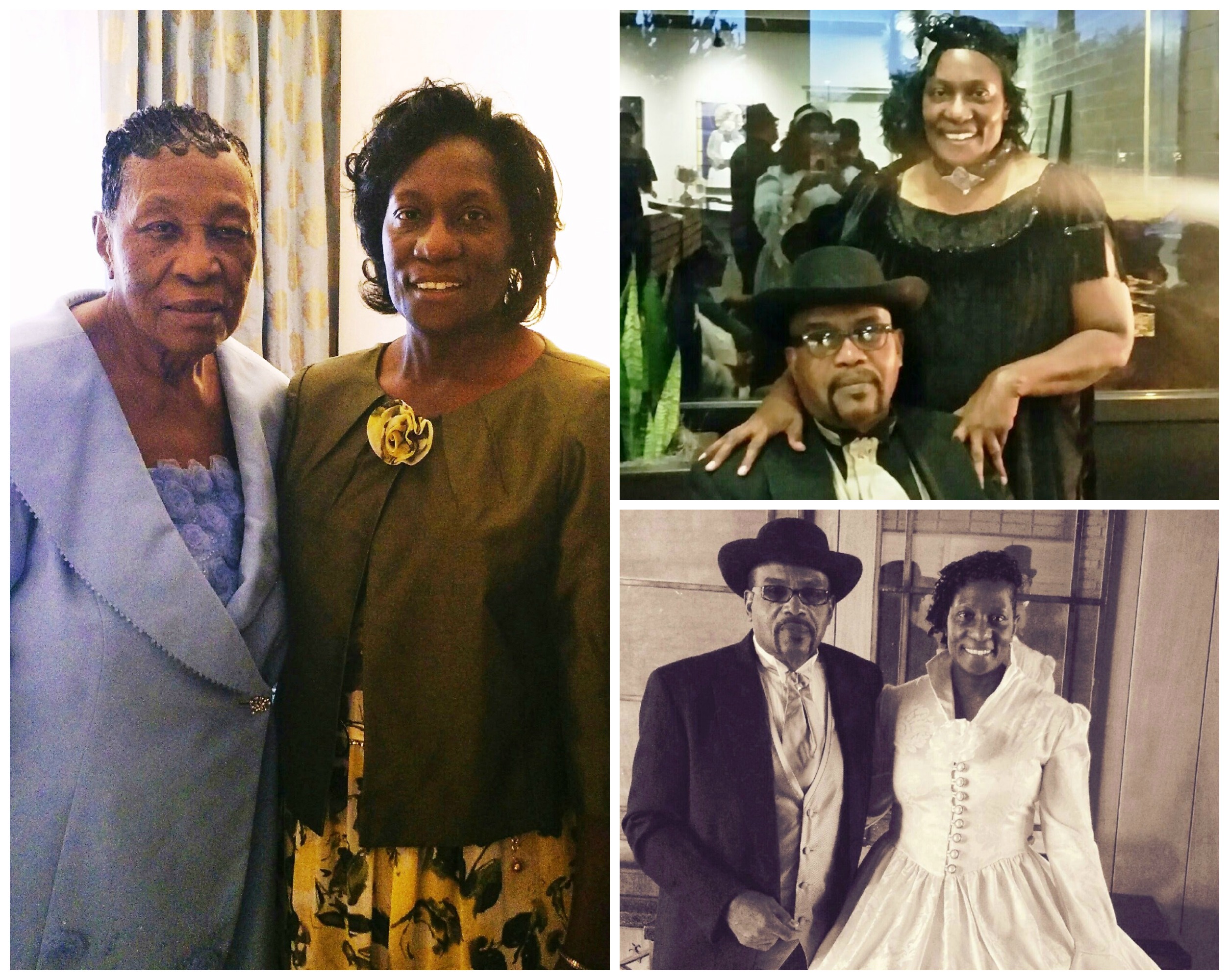 Left: Delphine and her mother Daphne Paige; Right top: Delphine and her husband Ben at a Rolling Twenties Gala Charity event in Phoenix, AZ; Right bottom: Delphine and husband Ben at a Gone with the Wind theme party.