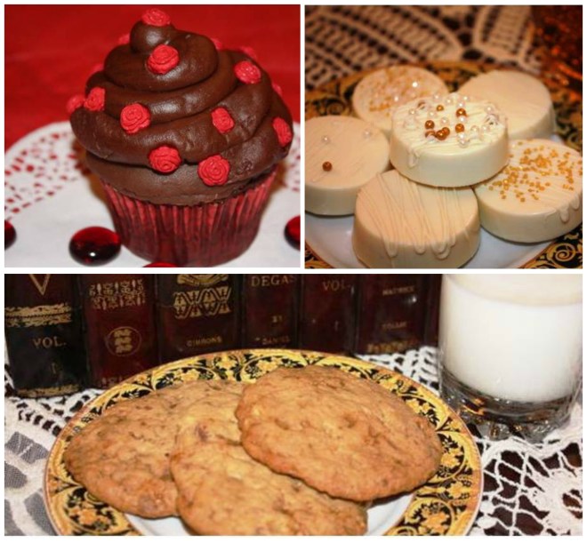 A few of Delphine’s creations. Left top: Devil’s Food Cupcake. Right top: White Chocolate Covered Peanut Butter Crackers. Bottom: Toffee Pecan Cookies.