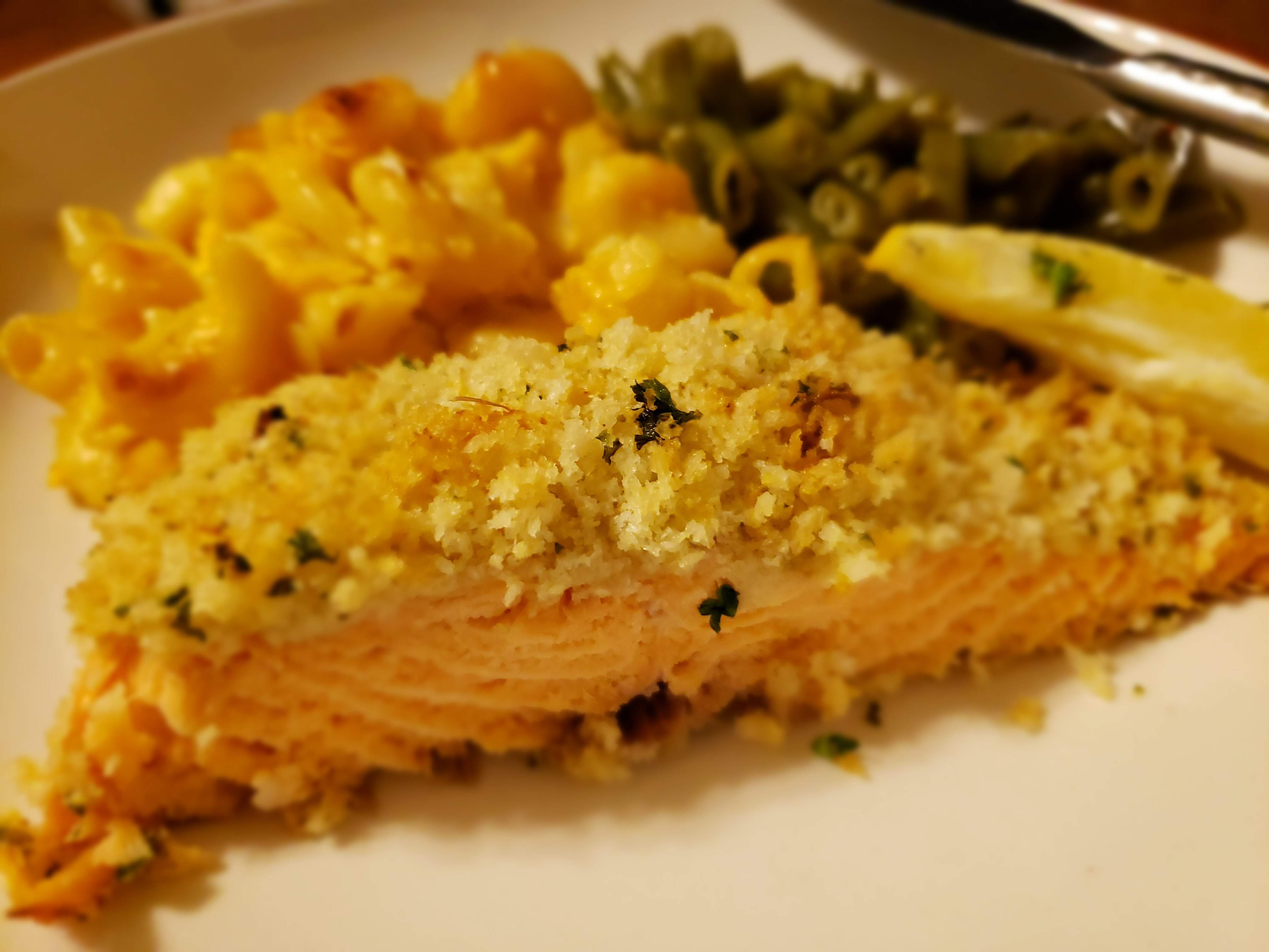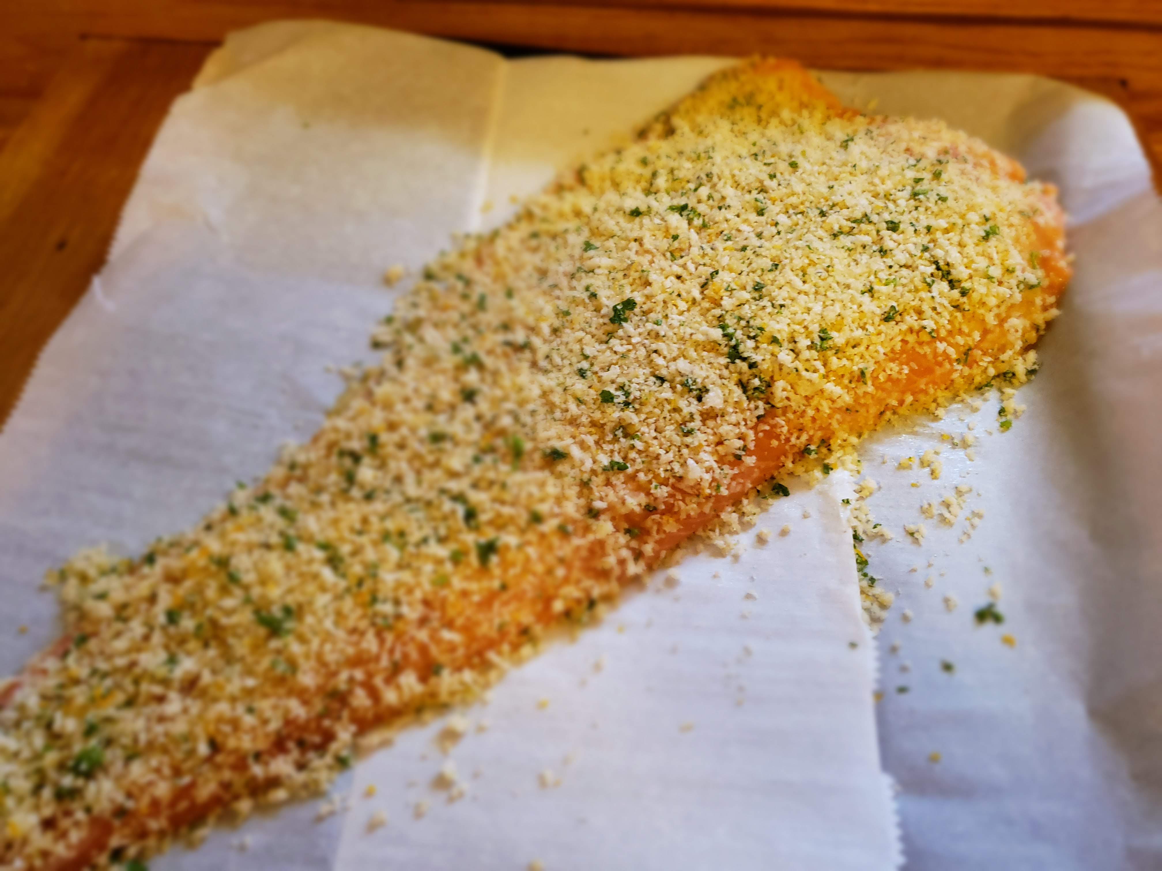 - Spread the Panko mixture evenly over salmon filet covering the entire surface, and lightly press the Panko mixture on to the surface to make sure it stays on.