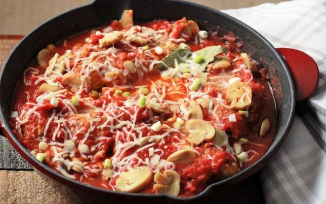 Left: Parmesan crusted chicken tenders. Right. Chicken tenders transformed into Chicken Picatta. Photo credit: Food Network app.