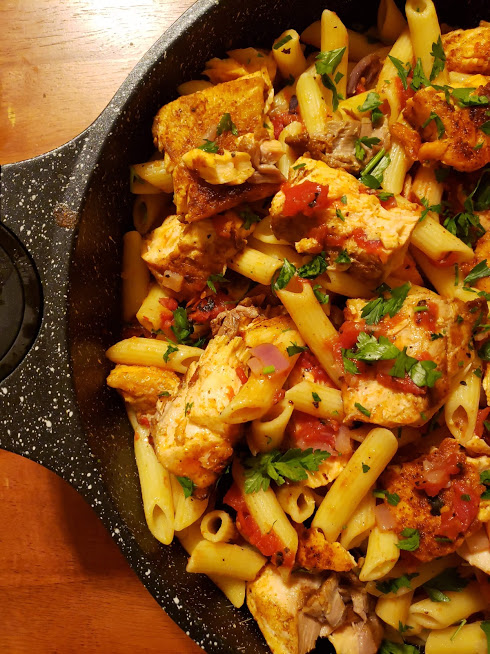 Add cooked pasta to sauce in the skillet and mix well. Add half of the pasta water to loosen sauce. Add more if necessary.