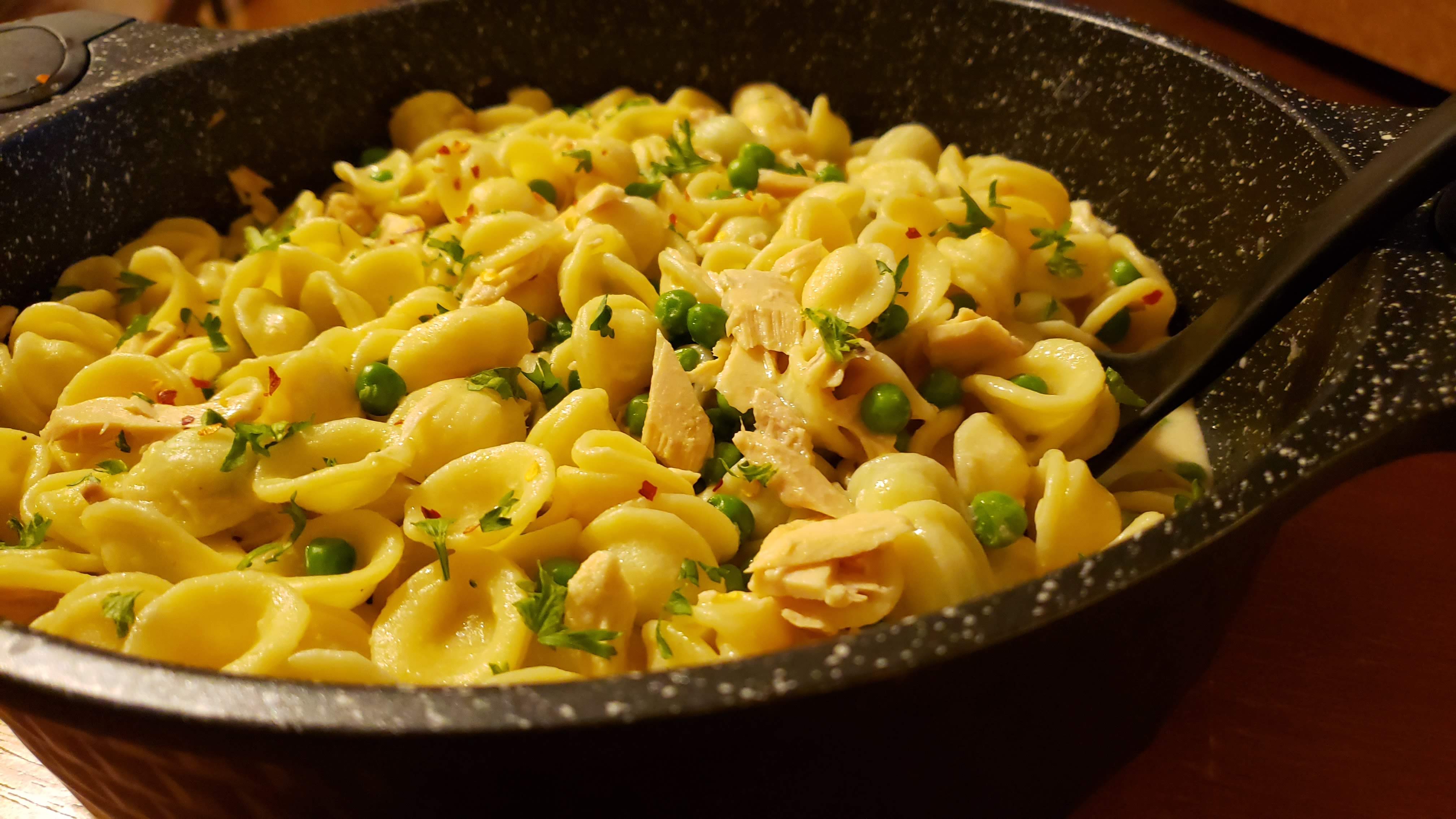 This zhuzhed up version is a delicious departure from the cheesy version I used to make. It’s still budget friendly but it’s certainly not your mom’s or grandma’s tuna noodle casserole. It has a light, delicate sauce made with evaporated milk and fresh grated Parmesan cheese infused with fresh lemon juice and grated lemon zest. The albacore tuna that gets added to this dish kisses the lemony sauce that clings to the pasta like a long lost relative. Oh and this recipe brushes aside traditional elbow macaroni and instead uses orecchiette pasta – which is such a family friendly and fun shape for the kids.