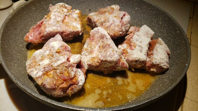 I generously seasoned the neck bones with salt, pepper, garlic powder and chipotle chili pepper for a little smokiness. After dredging the seasoned neck bones in flour, I browned them in a skillet, then added them to the pressure cooker. I made a roux with the pan drippings which I poured over the neck bones.
