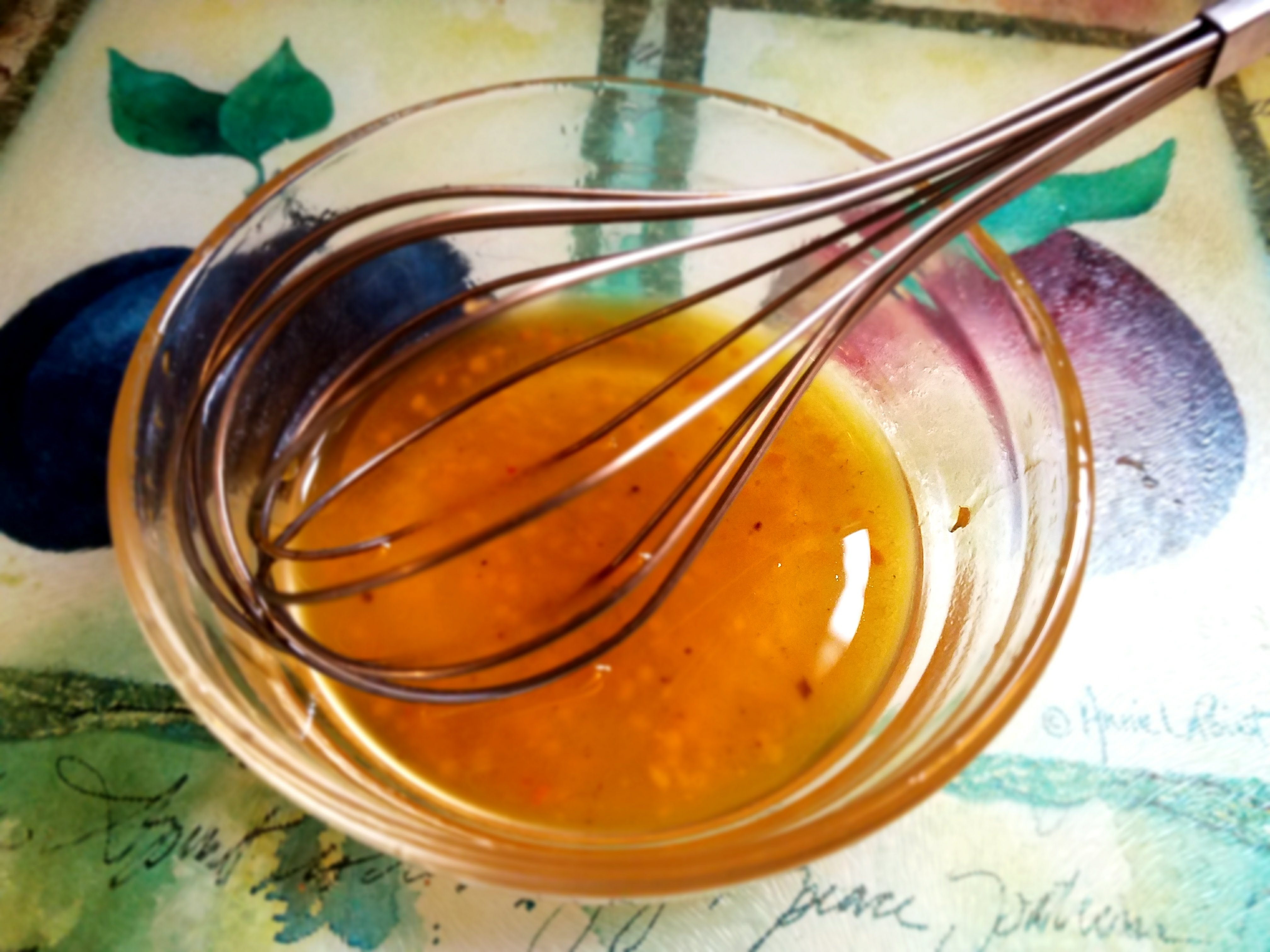 - To a small mixing bowl add olive oil, chopped garlic, salt, Dijon Mustard, sesame seed oil and sugar, and whisk with a wire whisk or fork until the mixture is emulsified or comes together.