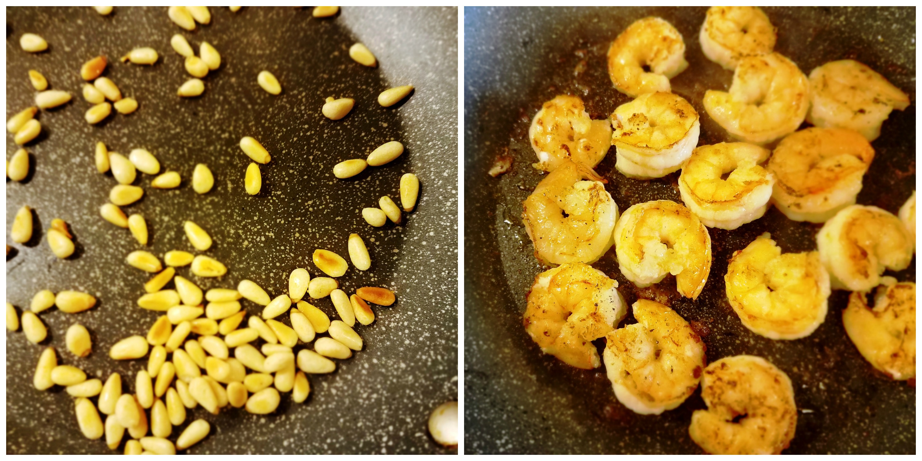 To a non-stick skillet set on medium heat, add pine nuts and stir until lightly browned. Remove from pan and set aside in a separate dish.