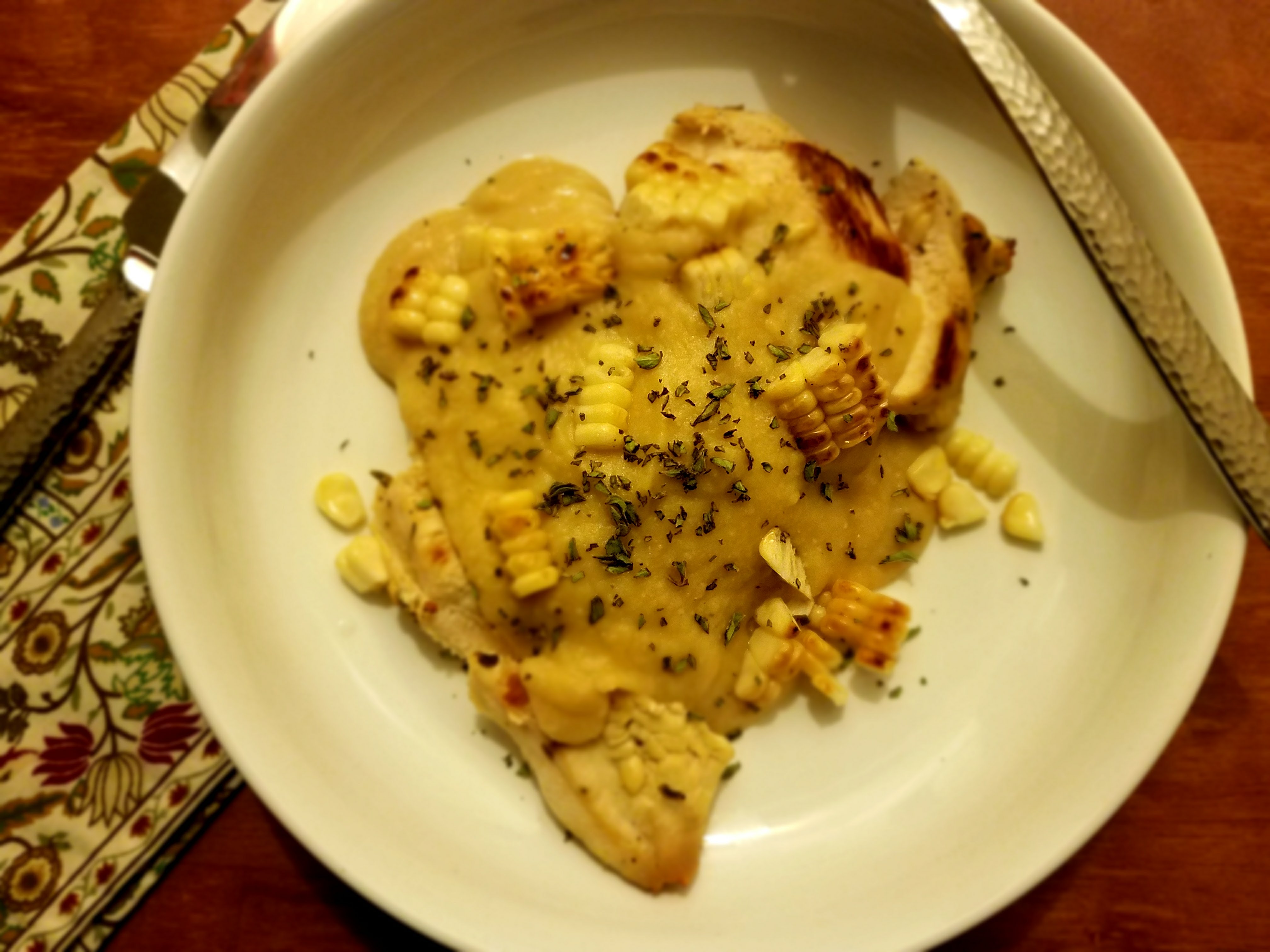 - Place a chicken breast on a plate, spoon Chick Pea sauce over breast, top with grilled corn and fresh chopped thyme. (Note: as featured here, chicken breasts are sliced at a diagonal before plating. See “Happy New Year, happy new food,” for example.