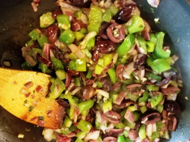 Add chopped garlic and sauté until fragrant, just under a minute. - Add both cans of fire-roasted tomatoes, Kalamata olives, chopped red onion, ¼ cup olive oil, ½ teaspoon salt, ¼ teaspoon red pepper flakes, and cracked pepper (to taste). Mix well.