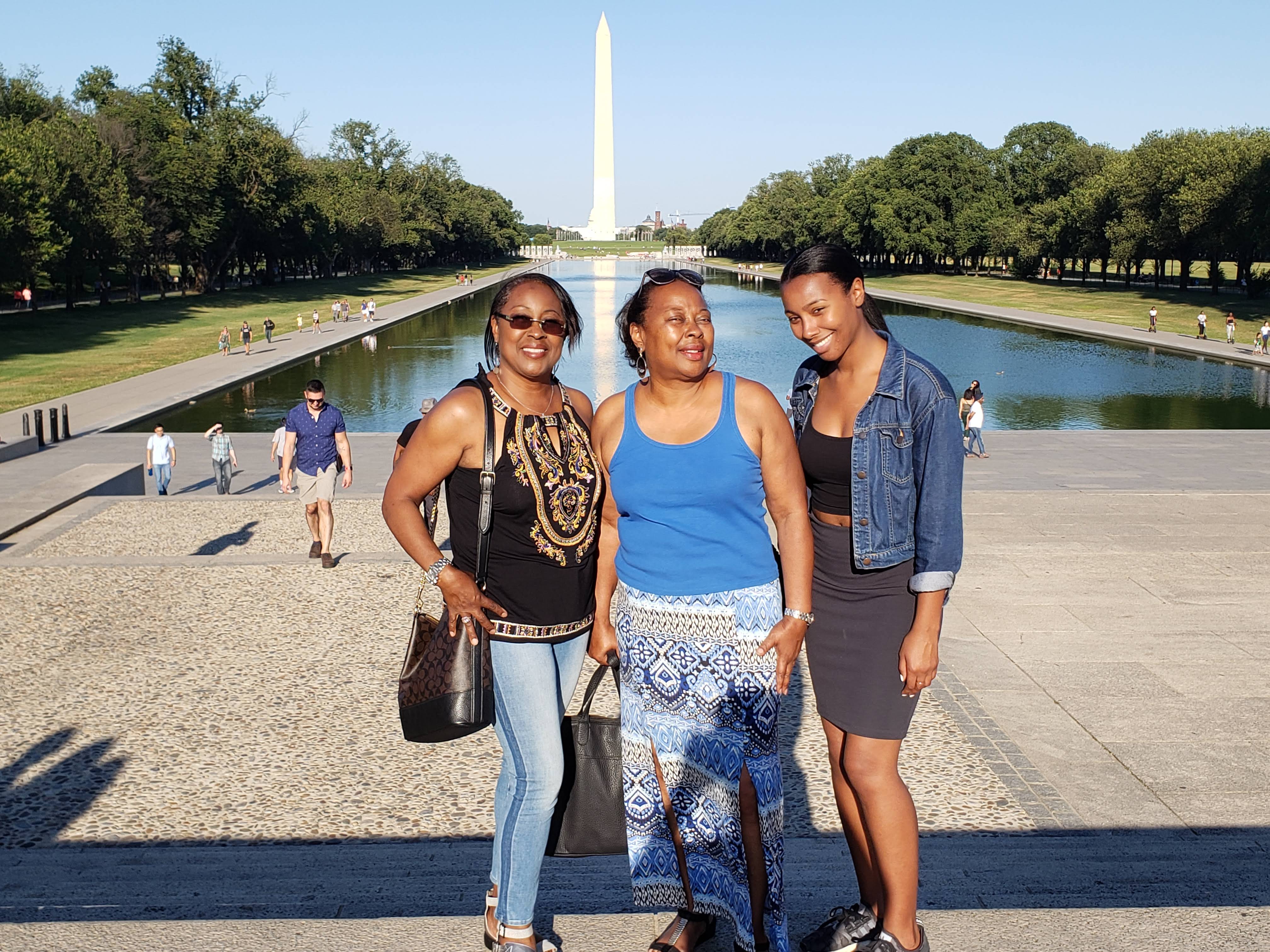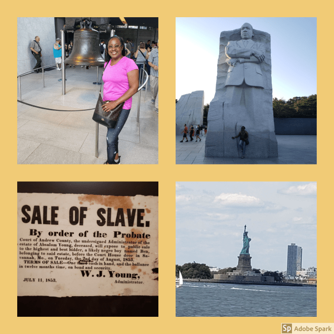 Top left to right: National Constitution Center Liberty Bell; Martin Luther King Jr. Memorial. Bottom left to right: photo exhibit from National Museum of African American History and Culture; Statute of Liberty view from Staten Island Ferry.