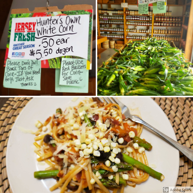 The pasta recipe I made for Karen is shared here. I call it Karen’s Vegetarian Pasta simply because I made it specifically for her and as you’ve probably noted, she’s a vegetarian. The star of the recipe is fresh, picked daily, sweet corn we got from Hunters Farm Market in Cinnaminson, New Jersey.